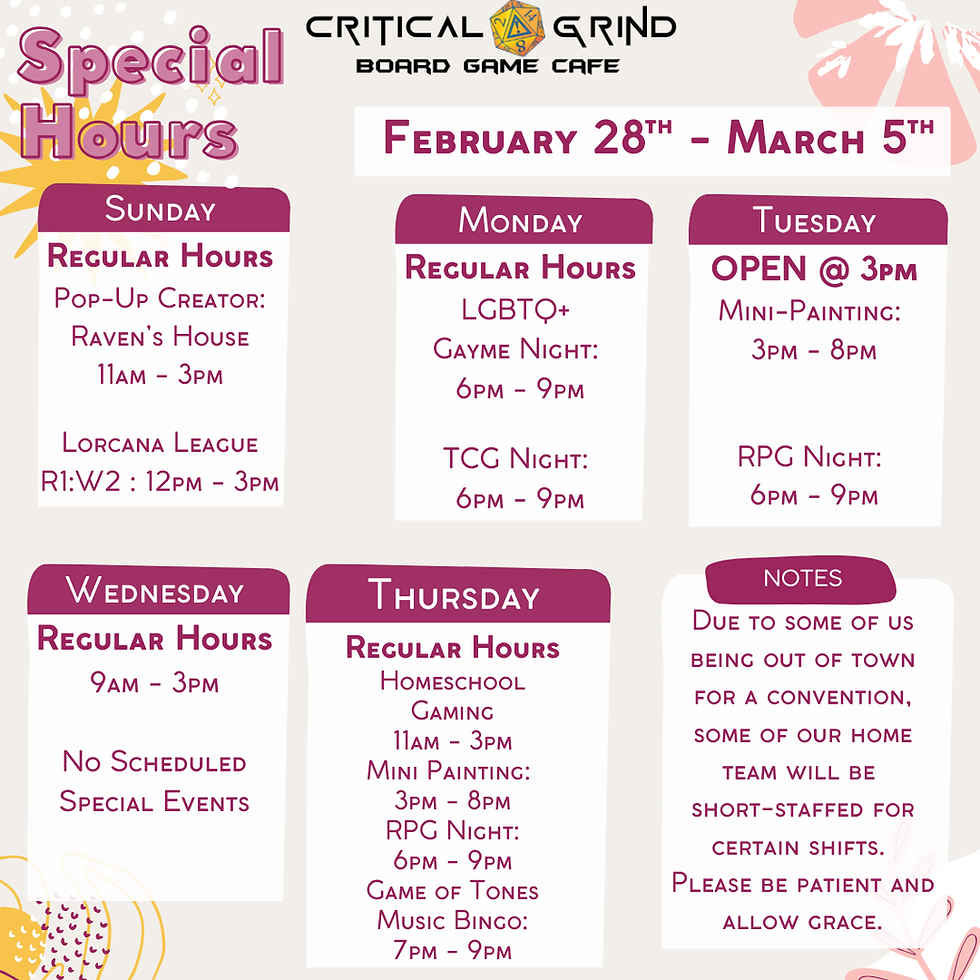 This is a quick look at this week's events. And of course any day is Game Day at Critical Grind. Just stop in anytime and find your next favorite game.
