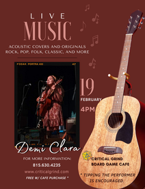 Sunday, February 19th is our first live music event. Local musician, Demi Clara, will be here performing from 4pm-7pm. This event is free, though we strongly encourage attendees to tip the performer.