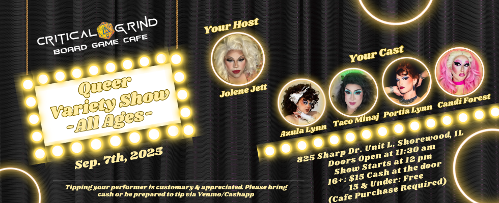 This is a quick look at this week's events. And of course any day is Game Day at Critical Grind. Just stop in anytime and find your next favorite game.